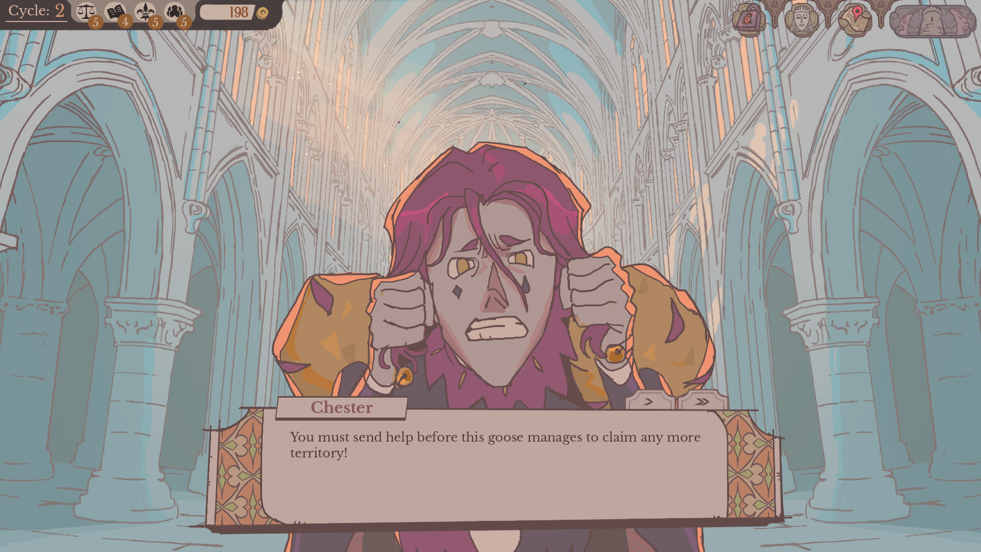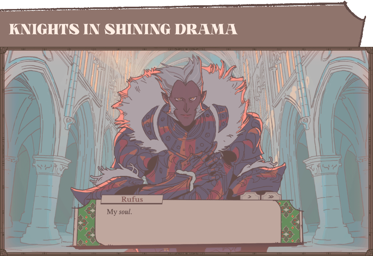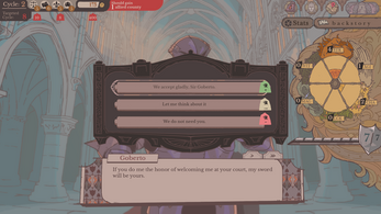 Absolutely amazing demo! I'm glad to see more work coming out of you guys, and the art is fantastic. The nods to Crown Gambit are fun, and the characters/dialogue here is amusing yet natural. UIs look nice, and for a demo, there's a lot of little flairs (like the character specific dialogue BGs) that really make it pop. Though frustrating, dealing with your knights on a personal level (quest preference/decision reactions) adds a level of complexity I really like. Knight-specific quest results are also interesting.