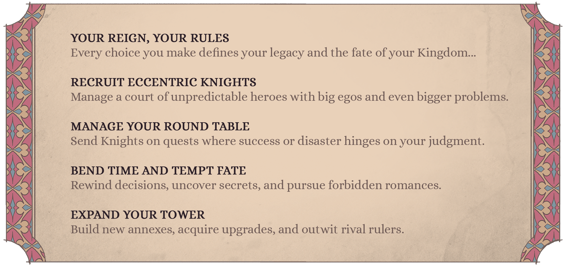 - Each decision you make will shape your kingdom and relationships with individuals, collectives and other rulers. Every interaction will play a part in defining your legacy.